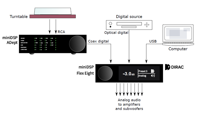 ADeptは、レコード再生に必要なPhonoイコライザーをDSPで高精度に実現しています。したがって、レコードプレーヤー出力をそのまま接続できます。
